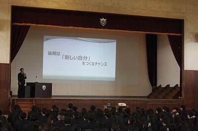 校長先生より「新しいことにチャレンジする」、「服装や挨拶、礼儀など凡事徹底して行うこと」についてのお話がありました。