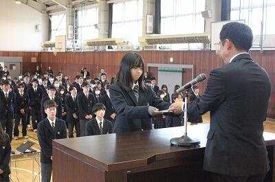 生徒会認証式では、新しく選出された生徒会執行委員のお披露目と、認証状の授与が行われました。