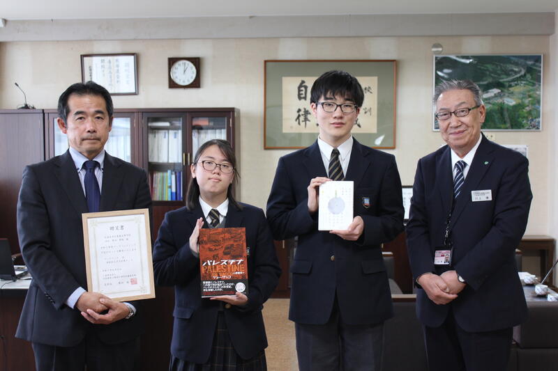 10月22日に弘済会参事川上 博様とジブラルタ生命保険の小藤田幸子様、玉森弘美様が来校され、校長室にて贈呈式を行いました。図書局員の代表生徒2名が川上様から贈呈書を受け取りました。